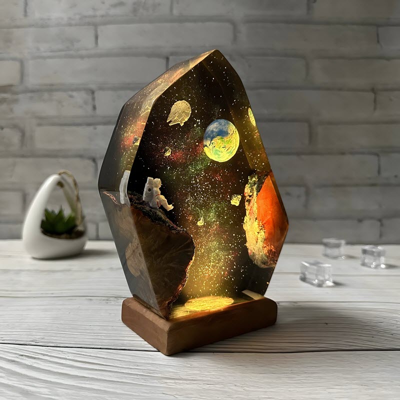 Khi bật đèn, ánh sáng lan tỏa từ phần đế gỗ, xuyên qua từng lớp resin, chiếu sáng hình ảnh Trái Đất và phi hành gia. Sự phản chiếu của các lớp epoxy tạo nên hiệu ứng chiều sâu – khiến người nhìn có cảm giác như đang quan sát vũ trụ qua một khung cửa sổ không gian. Ánh sáng ấm dịu không chỉ chiếu sáng căn phòng, mà còn mang lại cảm giác an yên và tĩnh tại. Giữa nhịp sống hối hả, ánh sáng ấy như một khoảng lặng, để ta tạm gác lại lo toan và đắm mình trong sự bình yên của vũ trụ bao la.