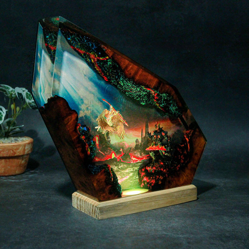 Phần đế của EPX082 được làm từ gỗ tự nhiên, giữ nguyên vân gỗ và màu sắc nguyên bản. Gỗ mang lại cảm giác ấm áp, cân bằng lại sự dữ dội của cảnh fantasy bên trong, giúp tổng thể sản phẩm không bị quá nặng nề hay lạnh lẽo. Đế gỗ được gia công chắc chắn, đủ trọng lượng để giữ đèn đứng vững trên bàn làm việc, kệ sách hay tủ trưng bày. Sự kết hợp giữa epoxy hiện đại và gỗ tự nhiên tạo nên vẻ đẹp vừa nghệ thuật vừa gần gũi, phù hợp với nhiều phong cách không gian khác nhau.
