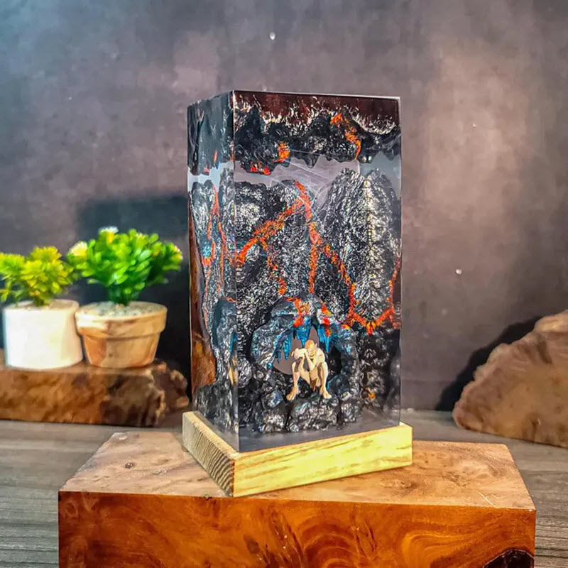 Đây không chỉ là một chiếc đèn trang trí mà còn là một tiểu cảnh thu nhỏ tái hiện không khí u tối, sâu hun hút của vực núi lửa nơi Gollum trông giữ chiếc Nhẫn Quyền Lực.