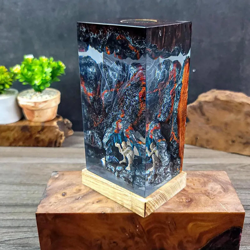 Thiết kế của đèn epoxy EPX048 được kết hợp từ nhiều lớp chất liệu và hiệu ứng để tạo nên một tiểu cảnh giàu chiều sâu, như mở ra cả một thế giới thu nhỏ trong lòng khối resin. Khối epoxy cao cấp được đổ trong nhiều lớp, trong suốt như pha lê, giúp mọi chi tiết bên trong hiển thị rõ ràng từ mọi góc nhìn. Khi ánh sáng len qua các lớp đá, màu, khói resin và những đường dung nham đỏ, chiều sâu nghệ thuật càng được nhấn mạnh, khiến người xem có cảm giác đang nhìn vào một vực tối thực sự.