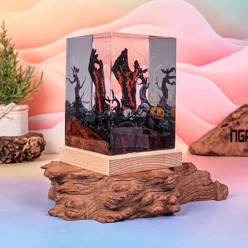 Đèn epoxy EPX068 được chế tác hoàn toàn thủ công bằng epoxy resin trong suốt kết hợp với đế gỗ tự nhiên. Lớp resin trong suốt giúp “đóng băng” toàn bộ cảnh nghĩa địa, giữ cho từng chi tiết luôn rõ nét và có chiều sâu. Bàn tay zombie được xử lý với hiệu ứng bề mặt như đang chảy ra dung nham đỏ rực. Khi bật đèn, ánh sáng xuyên qua lớp resin làm nổi bật các đường vân và màu sắc, khiến chi tiết này như đang phát sáng từ bên trong. Hiệu ứng này tạo cảm giác chân thực, giúp khung cảnh trở nên sống động hơn rất nhiều so với một mô hình trưng bày thông thường.