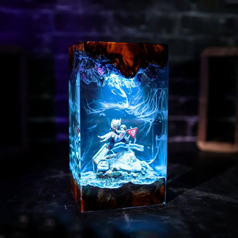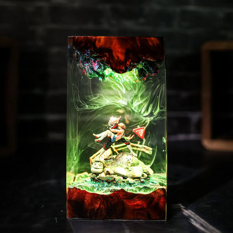 Không chỉ có nhân vật, EPX121 còn xây dựng cả một không gian tâm linh đầy màu sắc qua các chi tiết nhỏ xung quanh, tạo nên một bối cảnh cực kỳ cuốn hút. Những làn khói huyền ảo bằng màu resin được xử lý khéo léo, tạo hiệu ứng chiều sâu khi có ánh sáng xuyên qua. Sản phẩm sử dụng epoxy resin cao cấp, đảm bảo độ trong suốt như pha lê và không bị ố vàng theo thời gian. Phần đế và nắp đèn được làm từ gỗ tự nhiên lâu năm, giữ nguyên vẻ mộc mạc và sang trọng. Sự kết hợp giữa gỗ và resin tạo nên một tổng thể hài hòa, vừa hiện đại vừa cổ điển.