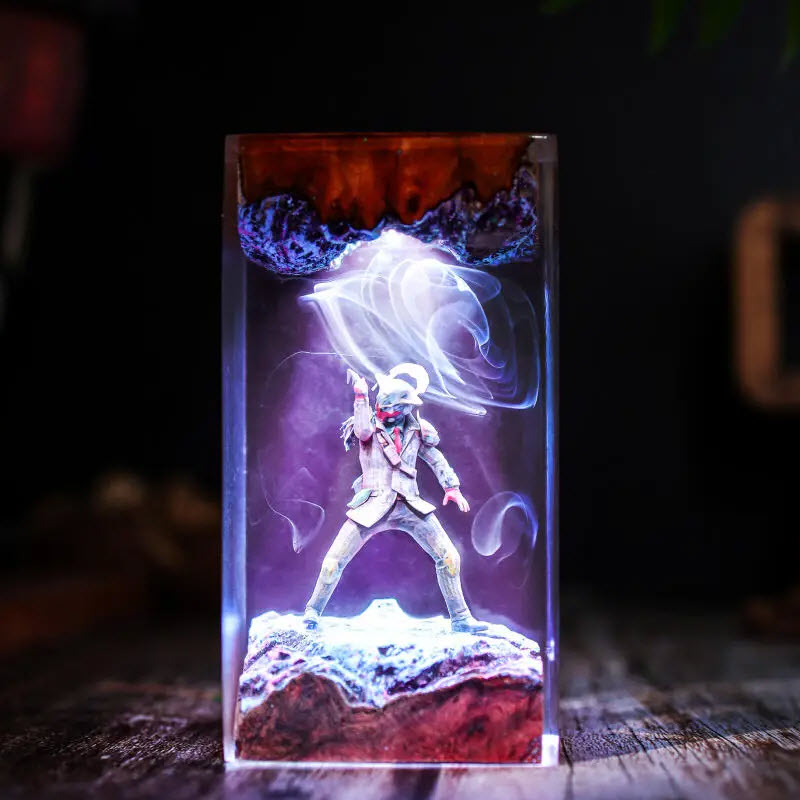 Điểm nhấn đặc biệt của EPX124 là những dải khói mờ ảo uốn lượn xung quanh nhân vật. Khi đèn bật sáng, những làn khói này tạo cảm giác kỳ ảo, mang lại trải nghiệm thị giác cực kỳ mãn nhãn. Khối nhựa Resin được xử lý chống ố vàng, giữ được vẻ đẹp trong suốt theo thời gian. Phần đế gỗ tự nhiên kết hợp hài hòa, tạo nên vẻ sang trọng và chắc chắn cho sản phẩm.