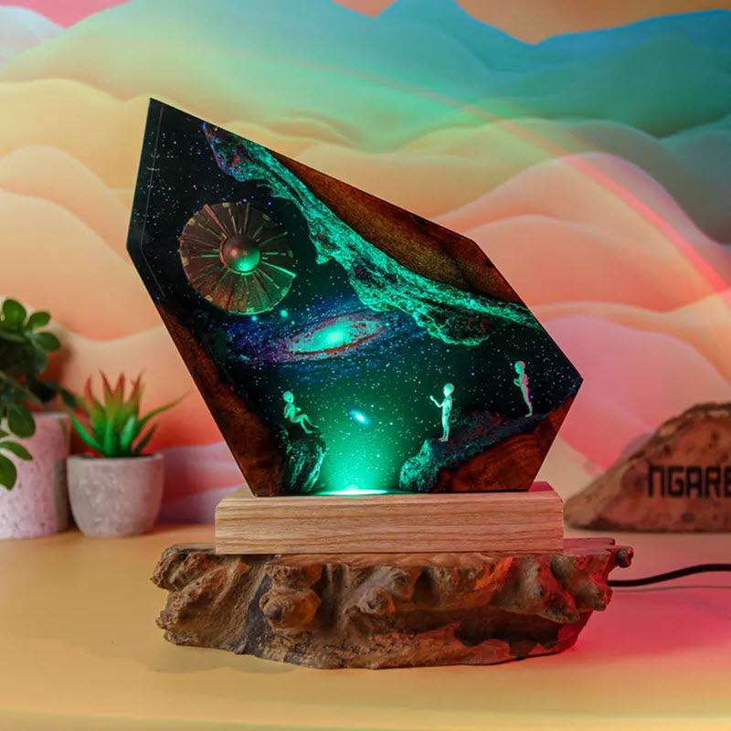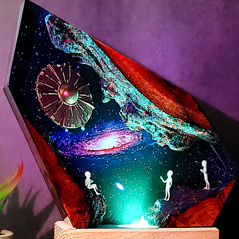 Nền thiên hà xoáy đa sắc mô phỏng không gian sâu thẳm, tạo hiệu ứng chuyển động nhẹ mỗi khi đổi màu; phía trên là UFO kim loại với những đường bo tròn và tâm phát sáng nổi bật. Bên dưới, ba nhân vật ngoài hành tinh đứng trên các vách đá bằng gỗ được tạo hình tỉ mỉ với biểu cảm tò mò sống động, trong khi kết cấu địa hình được xử lý bằng resin đặc kết hợp màu khoáng mang lại độ sần chân thật. Tất cả hòa quyện tạo nên một khung cảnh vũ trụ kỳ ảo, vừa đáng yêu, vừa đầy bí ẩn.