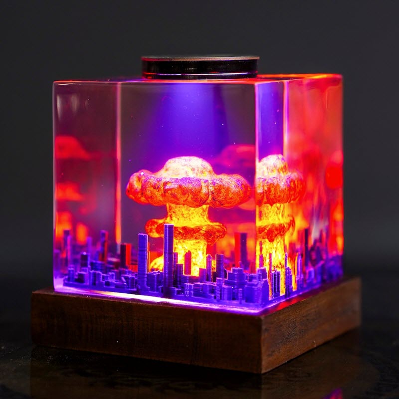 Mẫu đèn epoxy cao cấp EPX103 không chỉ đơn thuần là một thiết bị chiếu sáng, đây là một tác phẩm điêu khắc ánh sáng đầy ám ảnh, tái hiện một trong những khoảnh khắc khủng khiếp nhất của lịch sử nhân loại. Mẫu đèn thể hiện khoảnh khắc thành phố bị bao phủ bởi ánh sáng và khói lửa của đám mây hình nấm sau vụ nổ nguyên tử, được thu nhỏ và giữ lại trong một khối epoxy trong suốt.