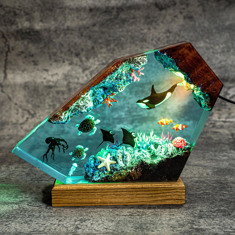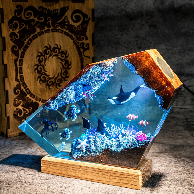 Đây không chỉ là một chiếc đèn ngủ hay đèn trang trí, mà còn là một lát cắt của biển sâu, được thu nhỏ tinh xảo trong khối epoxy trong suốt như pha lê.